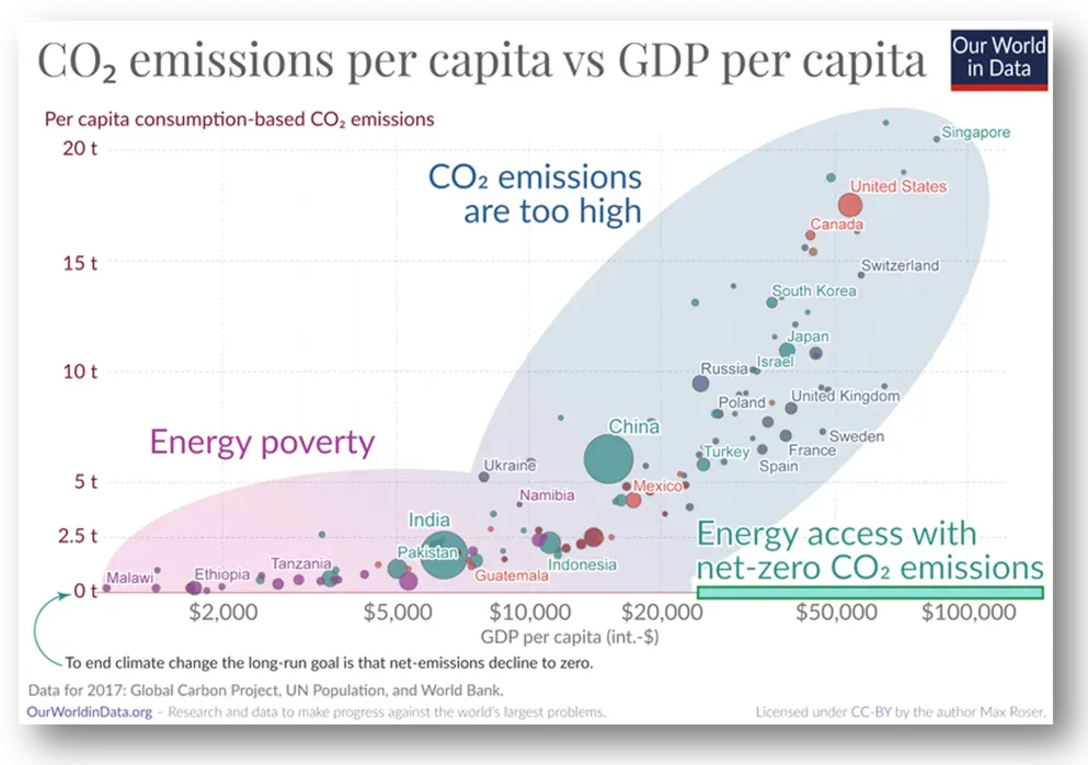 “Sì, ovviamente moriremo a causa dei cambiamenti climatici”, risponderebbero alla mia domanda la maggior parte delle persone preoccupate per il clima. Tuttavia, alcuni hanno iniziato a dubitare. Un esempio tipico è quello di Hannah Ritchie, che ha cambiato opinione, come riportato dal quotidiano The Guardian lo scorso anno: “Pensavo che la maggior parte di noi sarebbe morta a causa della crisi climatica. Mi sbagliavo”. Ora crede che moriremo a causa dei problemi ambientali, in particolare dell’inquinamento atmosferico, poiché questi sono oggi molto più letali. Non so se continui a sostenere che “l’obiettivo per i prossimi decenni è quello di portare il maggior numero possibile di paesi nel quadrato verde” e se il raggiungimento di questo obiettivo accelererà o rallenterà la nostra morte. Mi riferisco a un grafico che riproduco da un suo post su X, in cui ipotizza che avremo energia in abbondanza (e quindi molti soldi) [1] senza emissioni di anidride carbonica.